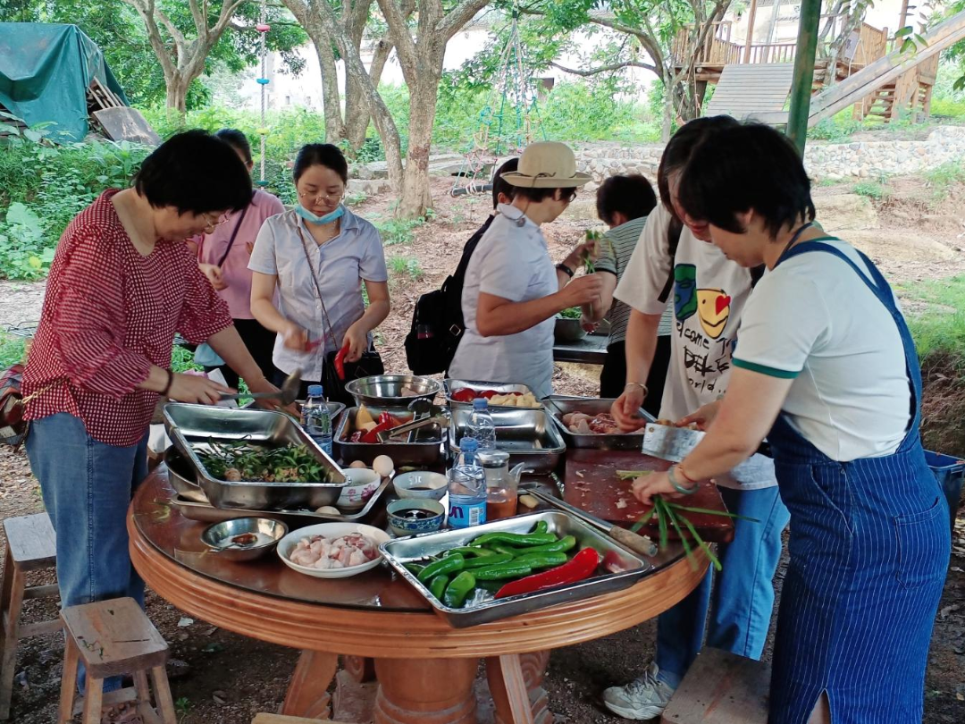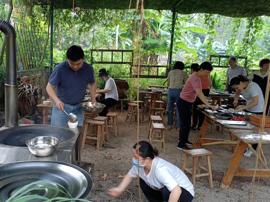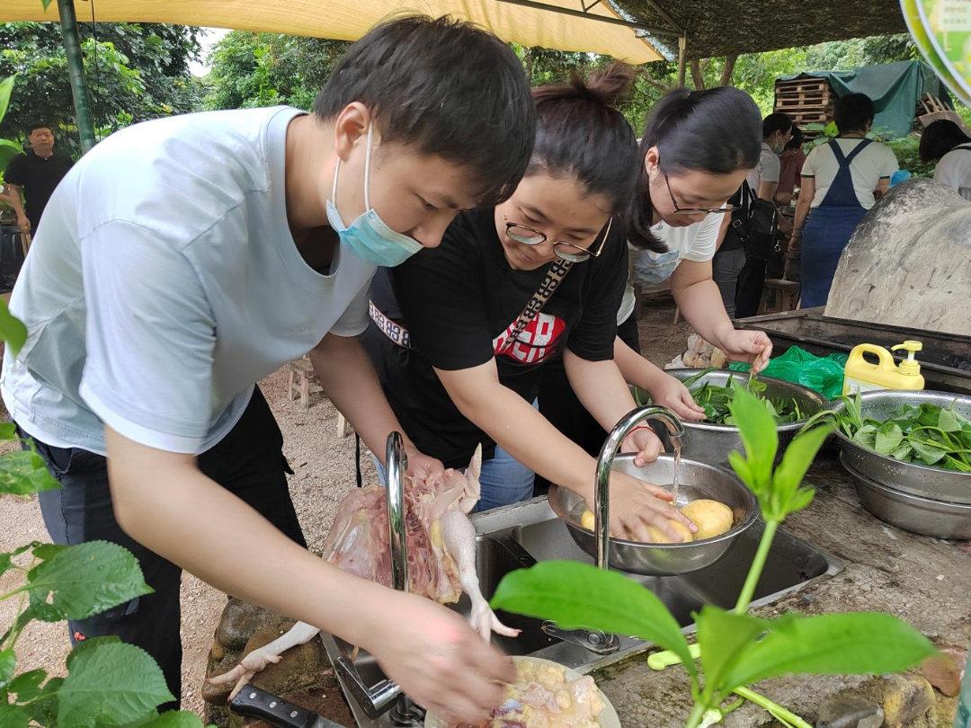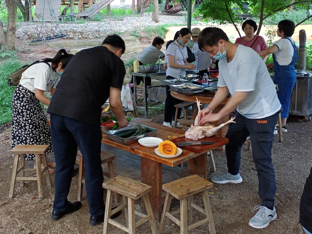 最後(hòu),開(kāi)展了“同做一桌菜、同吃一頓飯”團隊野炊活動。參加人員分成(chéng)5組,各組人員充分發(fā)揮團隊精神,分工協作,有的洗鍋、生火,有的洗菜、切肉,有的炒菜、蒸魚……大家各展其能(néng),各盡其才,物盡其用。不一會(huì)兒,炊煙袅袅,菜香四溢,一份份美食相繼出爐。當品嘗自己親手烹制的佳肴時(shí),所有人都(dōu)興緻勃勃,談笑風生,其樂融融。