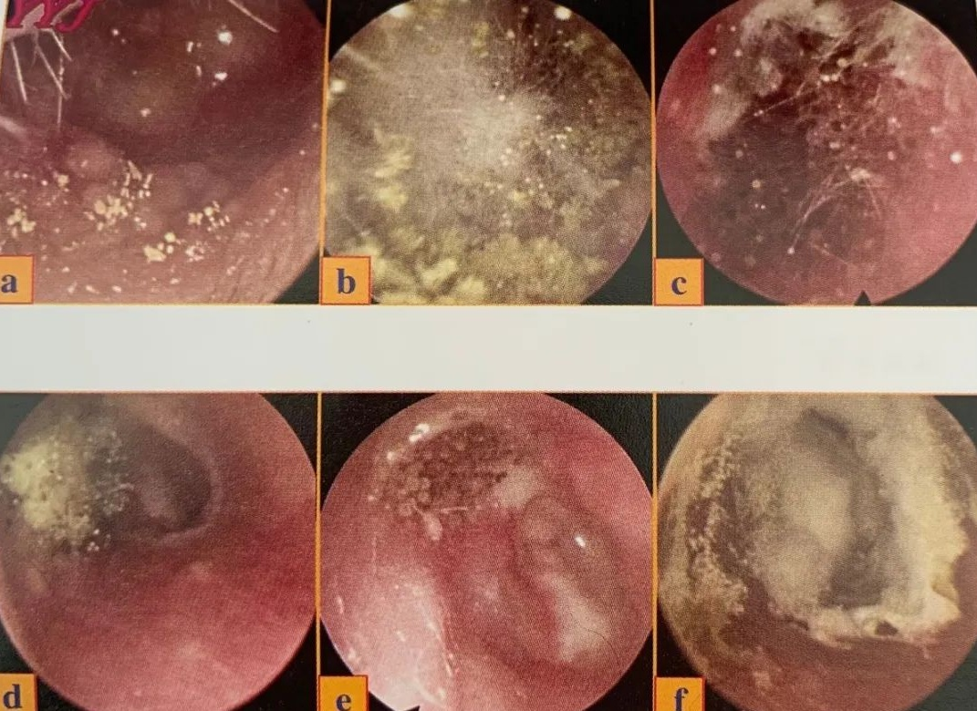 外耳道(dào)真菌病主要侵及皮膚的角質層,用溶液(消毒生理鹽水、過(guò)氧化氫溶液等)溶解真菌複合物後(hòu),在耳内鏡下用小吸引器吸引黏膿性分泌物及溶解後(hòu)的濕性産物,用幹棉簽拭幹後(hòu)再用藥,可以使藥物與受損皮膚充分接觸,從而最大程度減輕不适、提高療效、縮短病程。