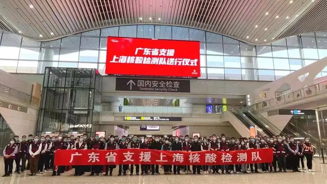 4月3日中午,惠州市15名核酸檢測隊員在陳江濤隊長(cháng)的帶領下趕赴廣州白雲機場與廣東省其它地市支援隊彙合,晚上9時(shí)許,廣東省支援上海核酸檢測支援隊一行300人抵達上海浦東機場。