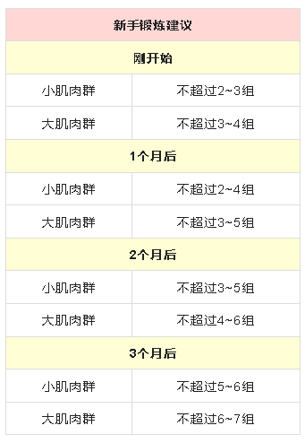這(zhè)樣(yàng)做除了能(néng)保證運動安全,先練大肌群還(hái)會(huì)調動更多肌肉參與,效果翻倍。建議新手練習的具體組數如表: