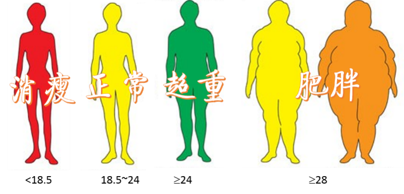 BMI即體重/身高²(kg/㎡),我國(guó)健康成(chéng)年人BMI:18.5≤BMI<24kg/㎡爲正常體重範圍,24≤BMI<28kg/㎡爲超重,BMI≥28kg/㎡爲肥胖。