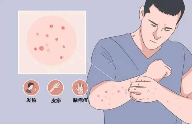 病毒潛伏期5~21天,多爲6~13天。發(fā)病早期出現發(fā)熱、寒戰、頭痛、嗜睡、乏力、背部疼痛和肌痛等前驅症狀,發(fā)病後(hòu)1至3天出現皮疹,病程約2至4周。皮疹結痂脫落後(hòu)可遺留紅斑或色素沉著(zhe),甚至瘀痕持續時(shí)間可長(cháng)達數年。部分患者可出現并發(fā)症,包括皮損部位繼發(fā)細菌感染、嘔吐和腹瀉引起(qǐ)的嚴重脫水、支氣管肺炎、腦炎、角膜感染等。2022年後(hòu)發(fā)現的病例臨床表現相對(duì)較輕且不典型。