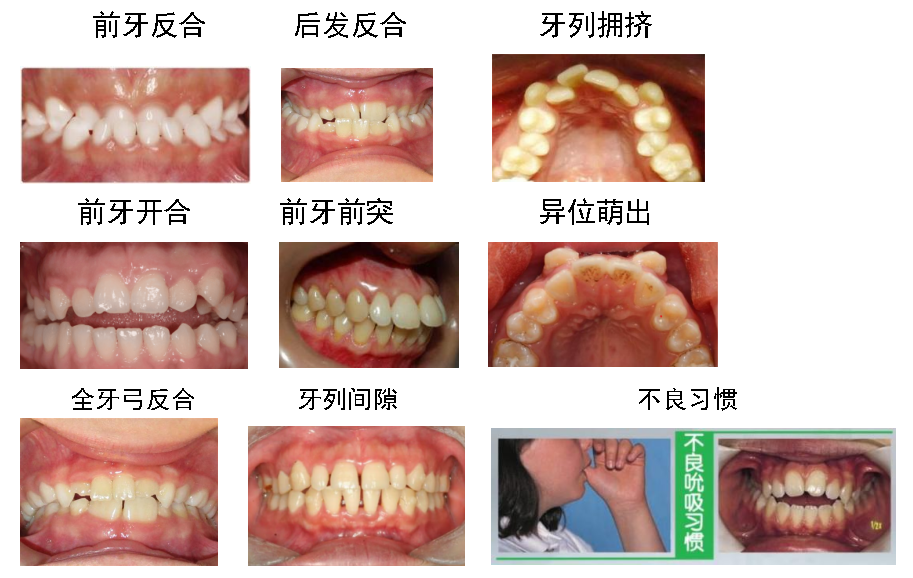 錯合畸形在臨床中常見表現有前牙反合、後(hòu)牙反合、牙列擁擠、前牙開(kāi)合、前牙前突、異位萌出、全牙弓反合、牙列間隙、不良習慣等。