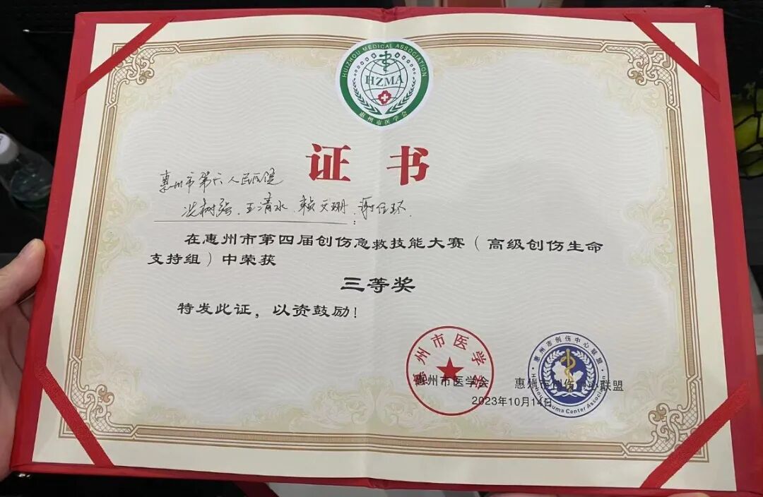 比賽當天,惠州六院創傷急救隊伍成(chéng)員之間密切合作,分工明确、互相配合,憑著(zhe)過(guò)硬的創傷急救素質和能(néng)力、臨場應變能(néng)力高質量地完成(chéng)創傷病例急救,并最終獲得競賽三等獎的好(hǎo)成(chéng)績!