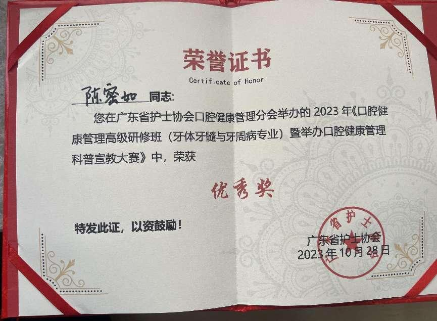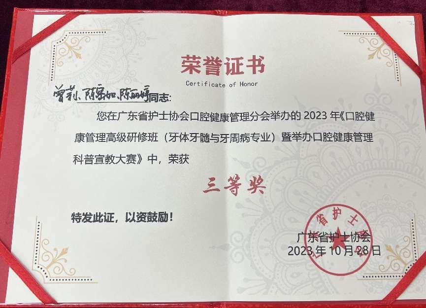 爲進(jìn)一步培養口腔健康管理專業人才,向(xiàng)患者傳播口腔保健知識和技能(néng),促進(jìn)全民口腔健康,10月27-28日,由廣東省護士協會(huì)、廣東省健康管理醫護聯盟口腔健康管理分會(huì)主辦,南方醫科大學(xué)口腔醫院承辦的第一屆《口腔健康管理高級研修班(牙體牙髓與牙周病專業)》暨口腔健康管理科普大賽在廣州舉行。來自全省各地的口腔護理人員齊聚一堂參加比賽。惠州六院口腔科護理團隊積極參賽備戰,精心鑽研選題,一路披荊斬棘,從來自十幾個省市的選手中脫穎而出,榮獲三等獎、優秀獎。