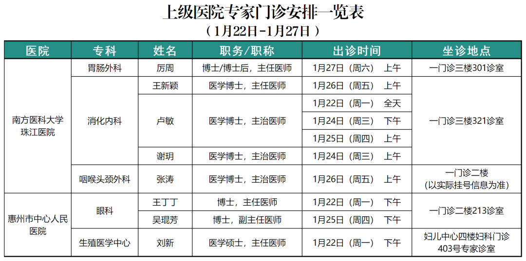 1月22日-1月27日排班情況如下