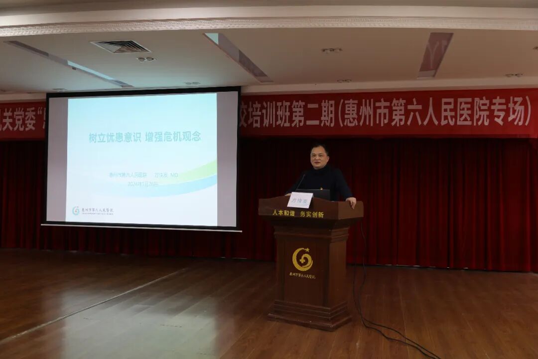 按照區委組織部、區直工委有關“思想鑄黨魂、學(xué)習增鬥志”黨員進(jìn)黨校三年培訓工作的部署要求,1月26日下午,區衛生健康局機關黨委在惠州六院多功能(néng)廳舉辦2024年第二期“思想鑄黨魂、學(xué)習增鬥志”黨員進(jìn)黨校培訓班(惠州六院專場)。培訓班邀請惠陽區抗疫先鋒宣講隊員,惠州六院黨委委員、副院長(cháng),醫學(xué)博士方快發(fā)作專題授課,醫院218名黨員參加了培訓。