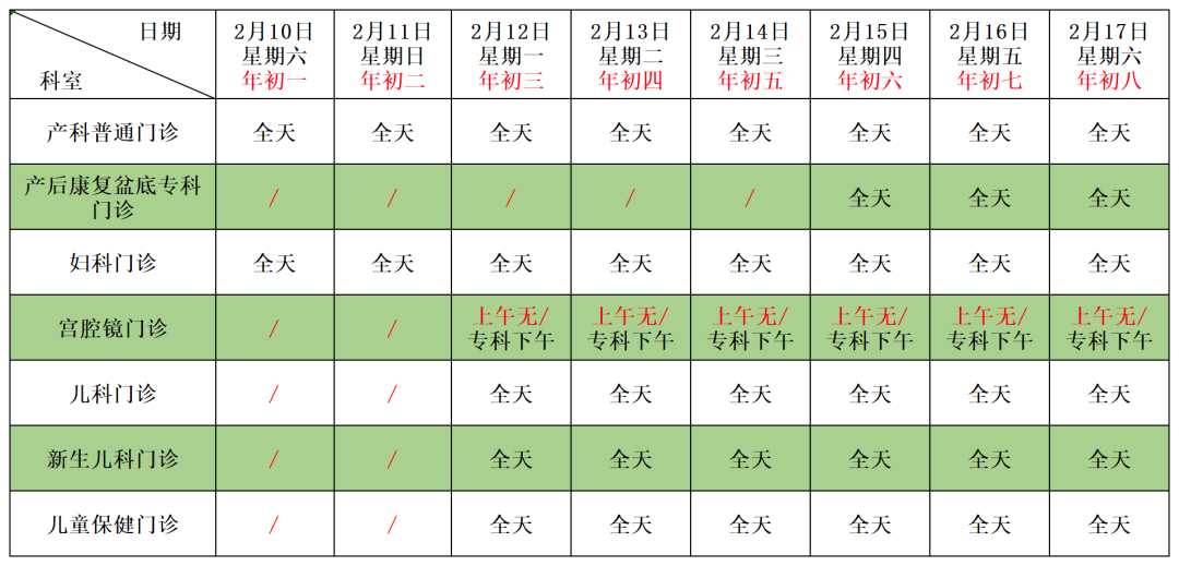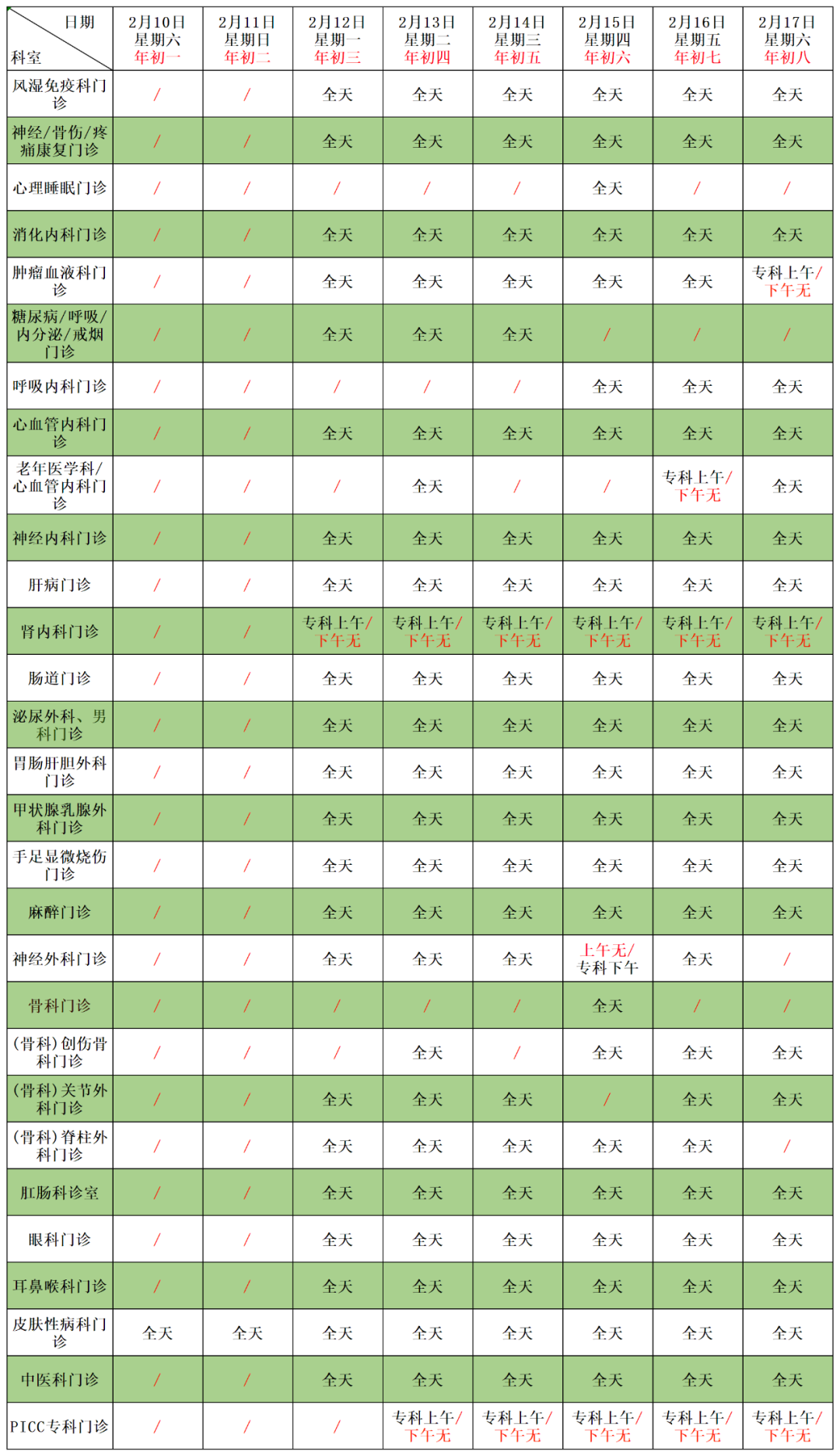 ②春節期間(2月10日-2月17日),院本部出診科室如下圖所示:
