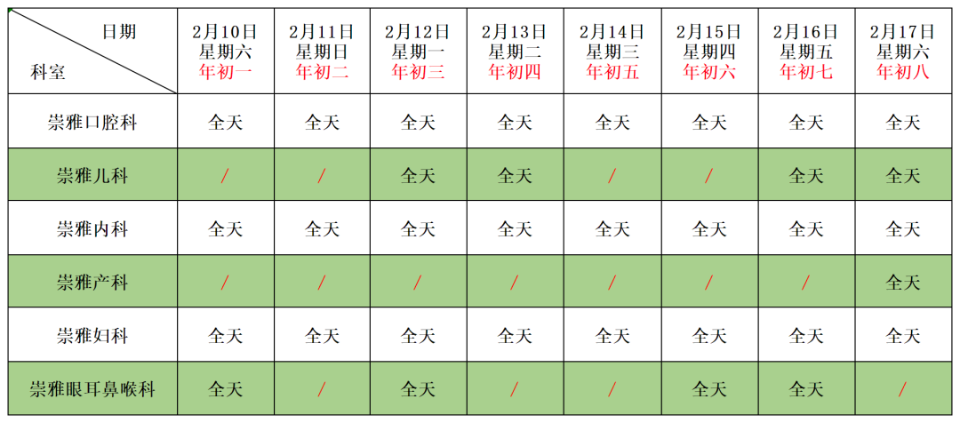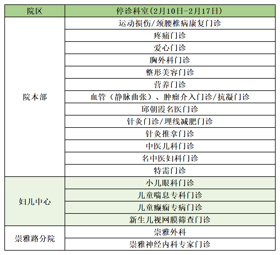 ③春節期間(2月10日-2月17日),院本部和崇雅路分院停診科室如下圖所示: