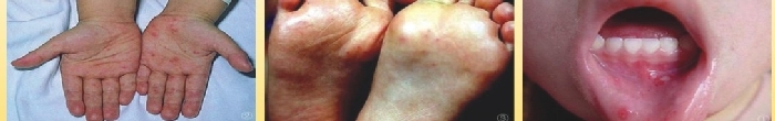 潛伏期爲2~7天,病初有點像感冒(流涕、咽痛、厭食等),患兒常有發(fā)熱,手、腳會(huì)出現水疱或紅疹,口腔出現潰瘍而影響食欲,這(zhè)些水疱或紅疹通常會(huì)在7~10天消退;嚴重并發(fā)症并不普遍,如出現精神不振、嗜睡、頻吐、持續高熱、手足無力、呼吸困難、頭痛腹痛、抽搐、手腳發(fā)涼等症狀,應盡快到醫院就(jiù)診,以免延誤病情。