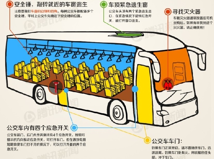 車上乘客男女老幼都(dōu)有,有序逃離至關重要。如果起(qǐ)火,千萬别擠在門口。如果你靠近門邊,可以協助司機使用應急開(kāi)關打開(kāi)車門。如果車門打不開(kāi),年輕力壯的男乘客可以使用安全錘,幫助大家從車窗逃生。同時(shí)女乘客可以安撫下老人和小孩。