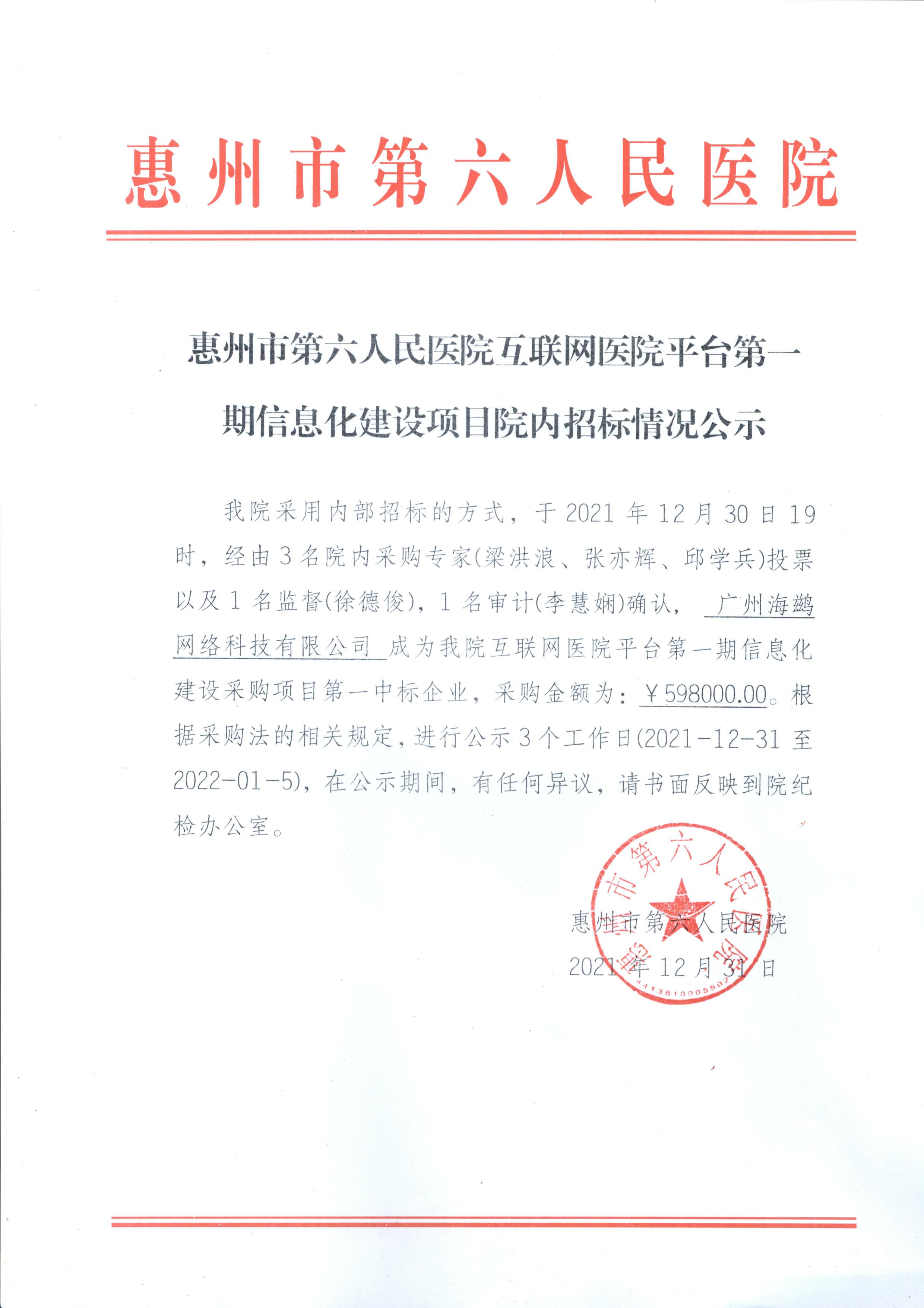 惠州市第六人民醫院互聯網醫院平台第一期信息化建設項目院内招标情況公示