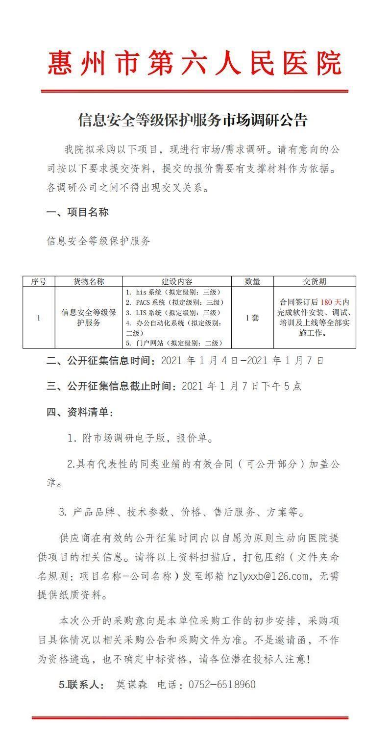 附件:惠州市第六人民醫院市場調研表(點擊下載)