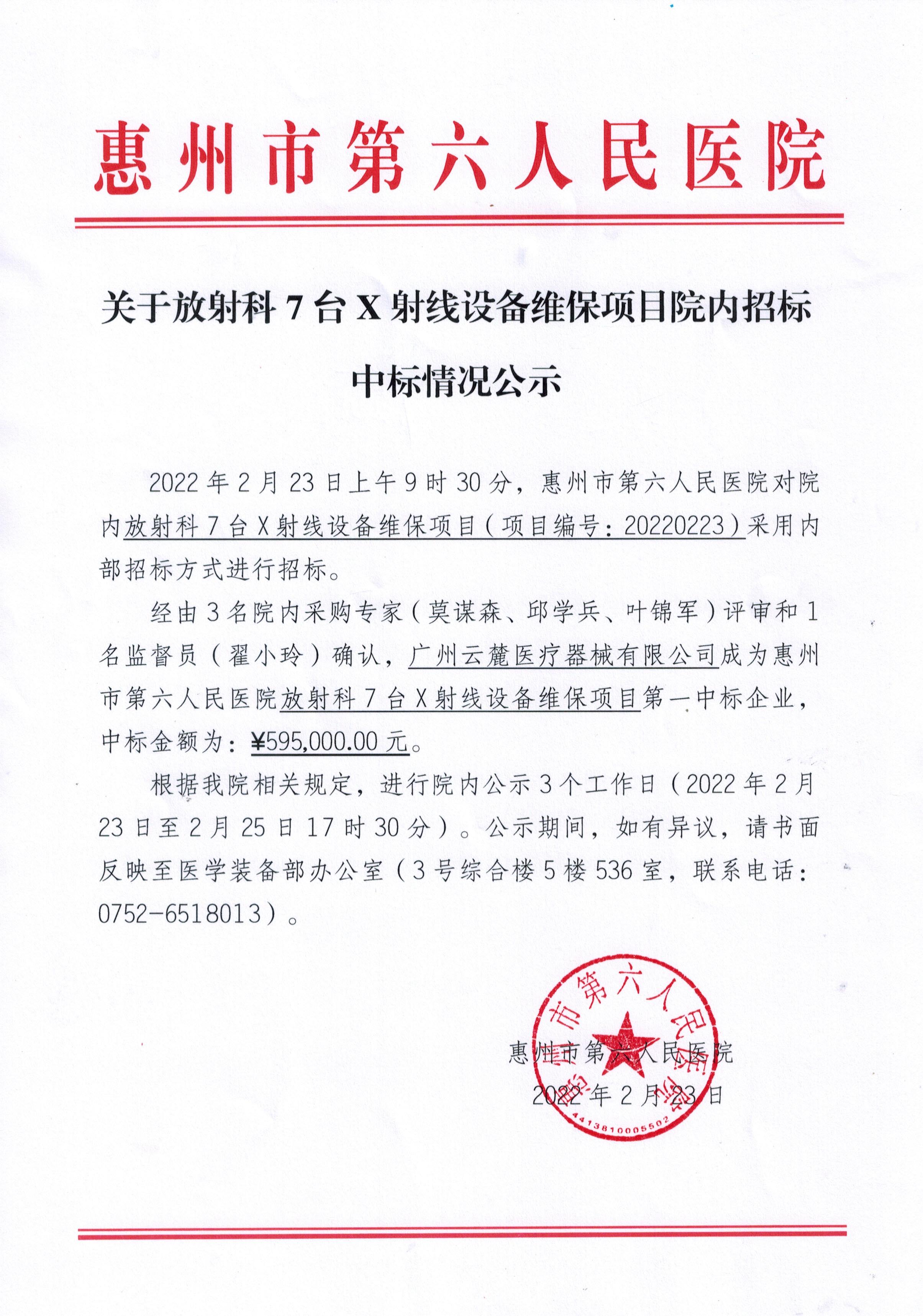 關于放射科7台X射線設備維保項目院内招标中标情況公示
