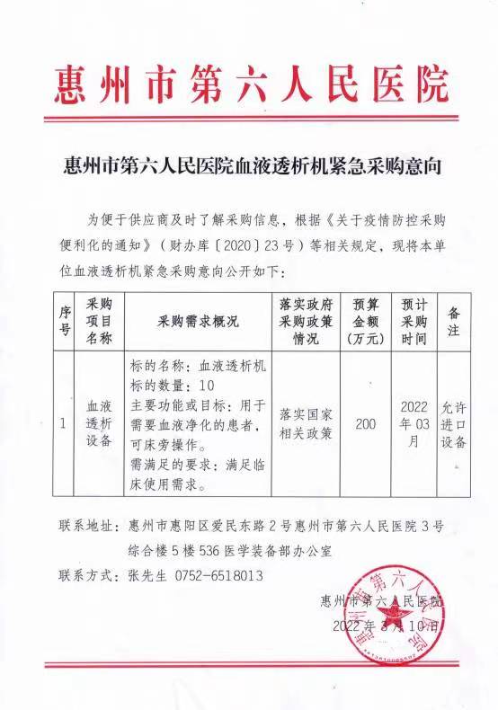 惠州市第六人民醫院血液透析機緊急采購意向(xiàng)