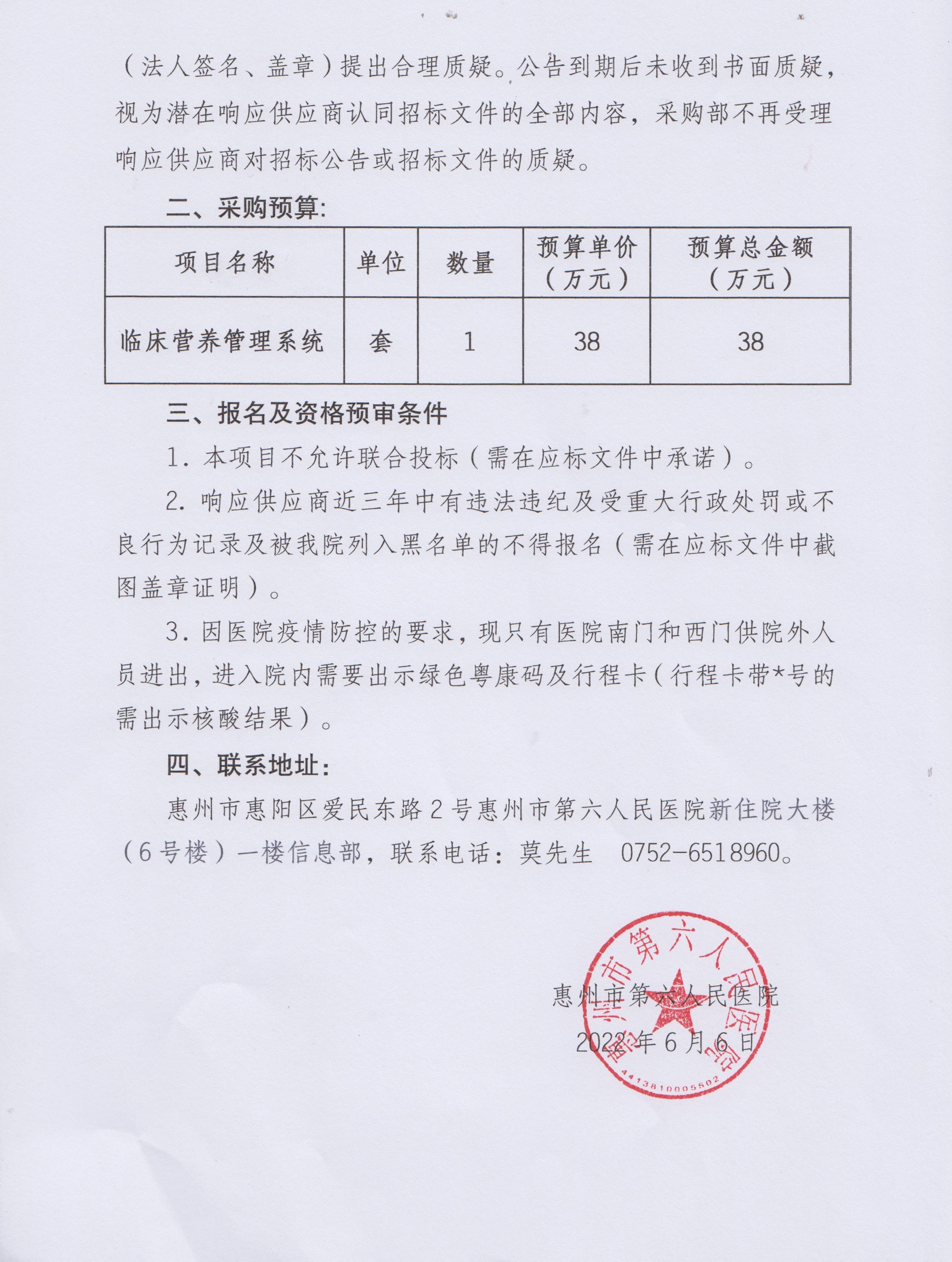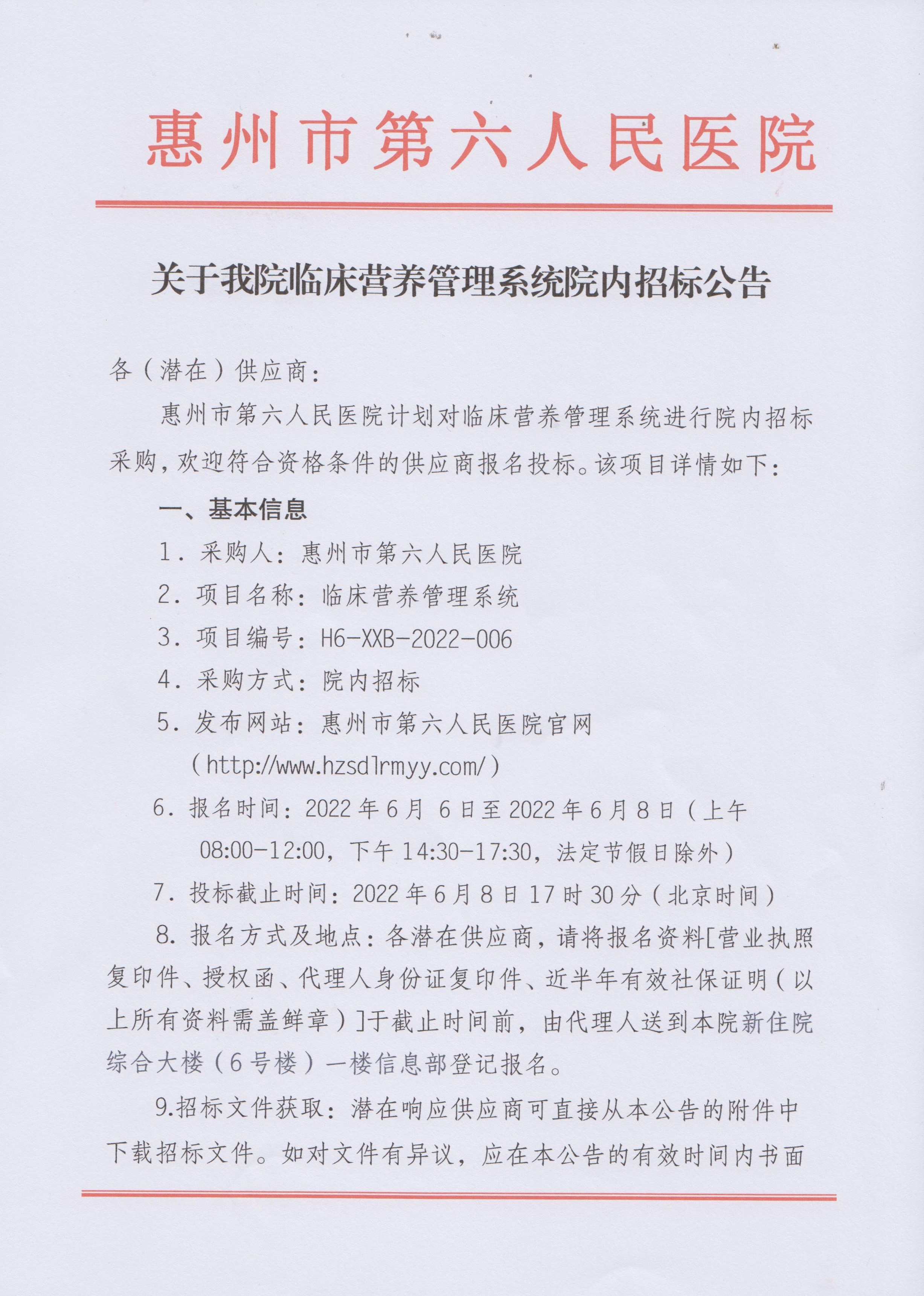 關于我院臨床營養管理系統院内招标公告