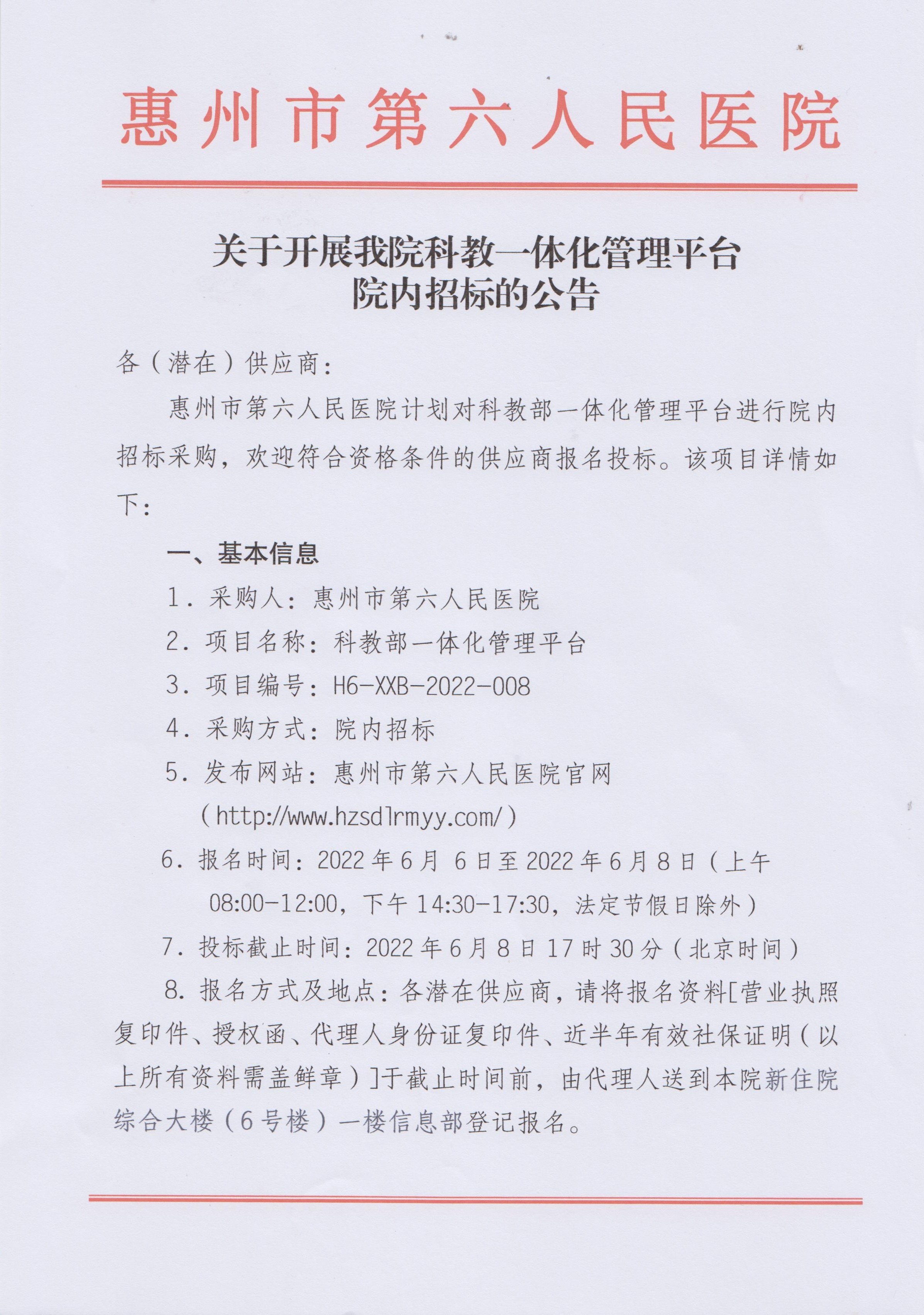 關于開(kāi)展我院科教一體化管理平台院内招标公告