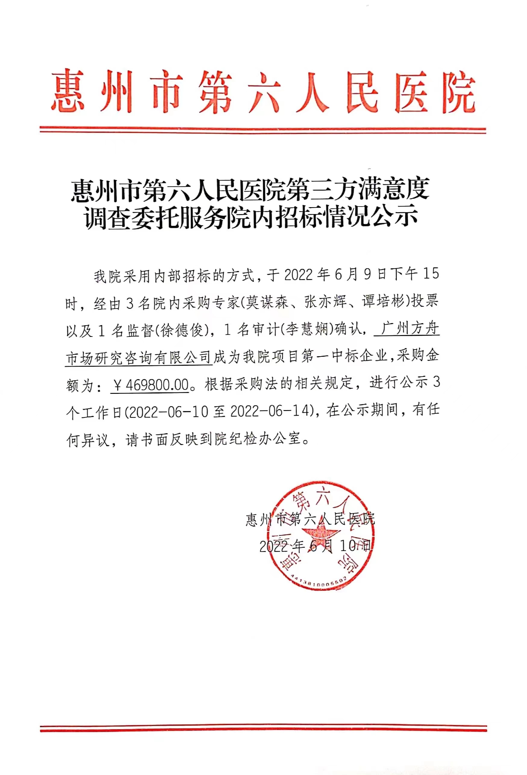 惠州市第六人民醫院第三方滿意度調查委托服務院内招标情況公示