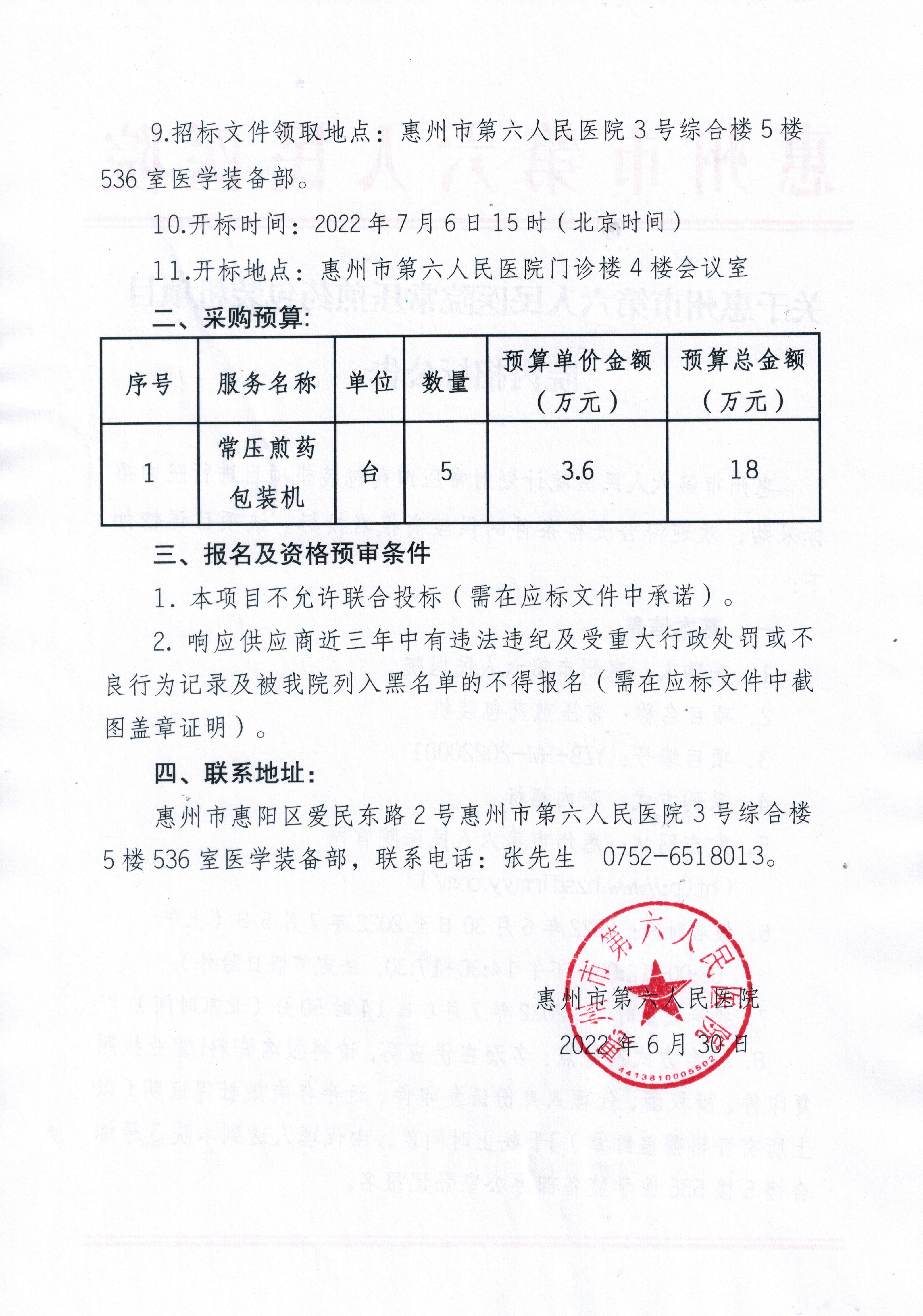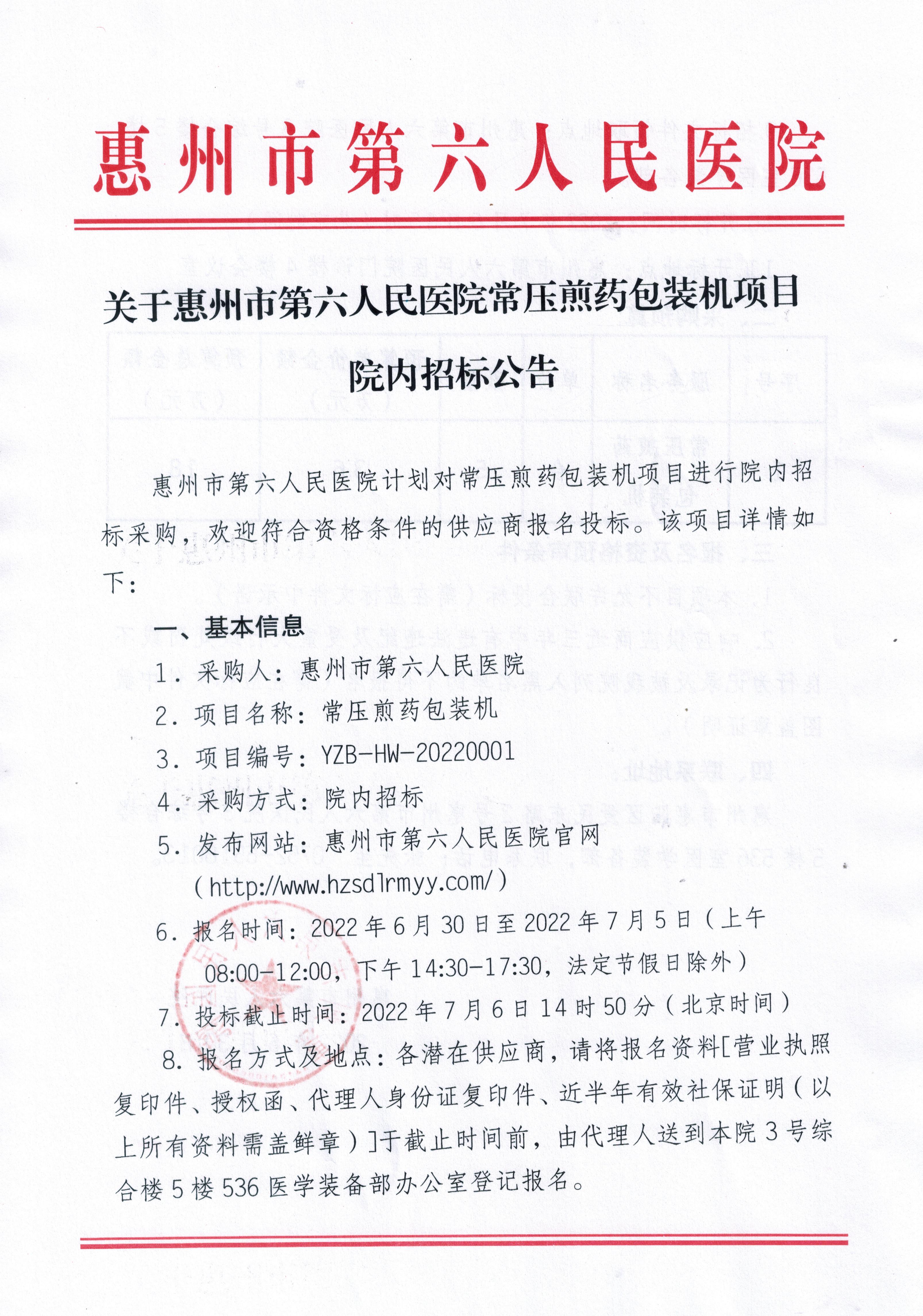 關于惠州市第六人民醫院常壓煎藥包裝機項目院内招标公告
