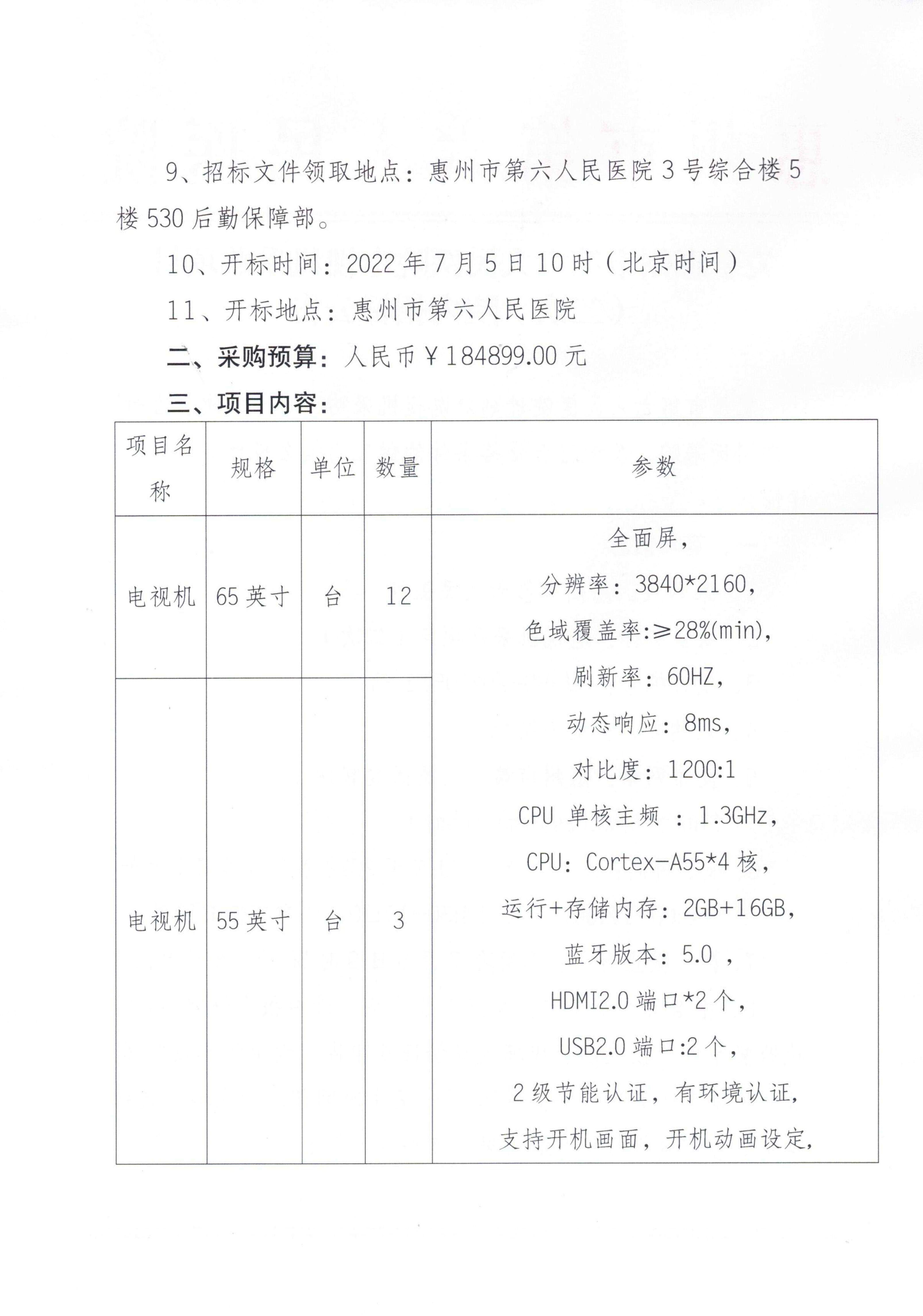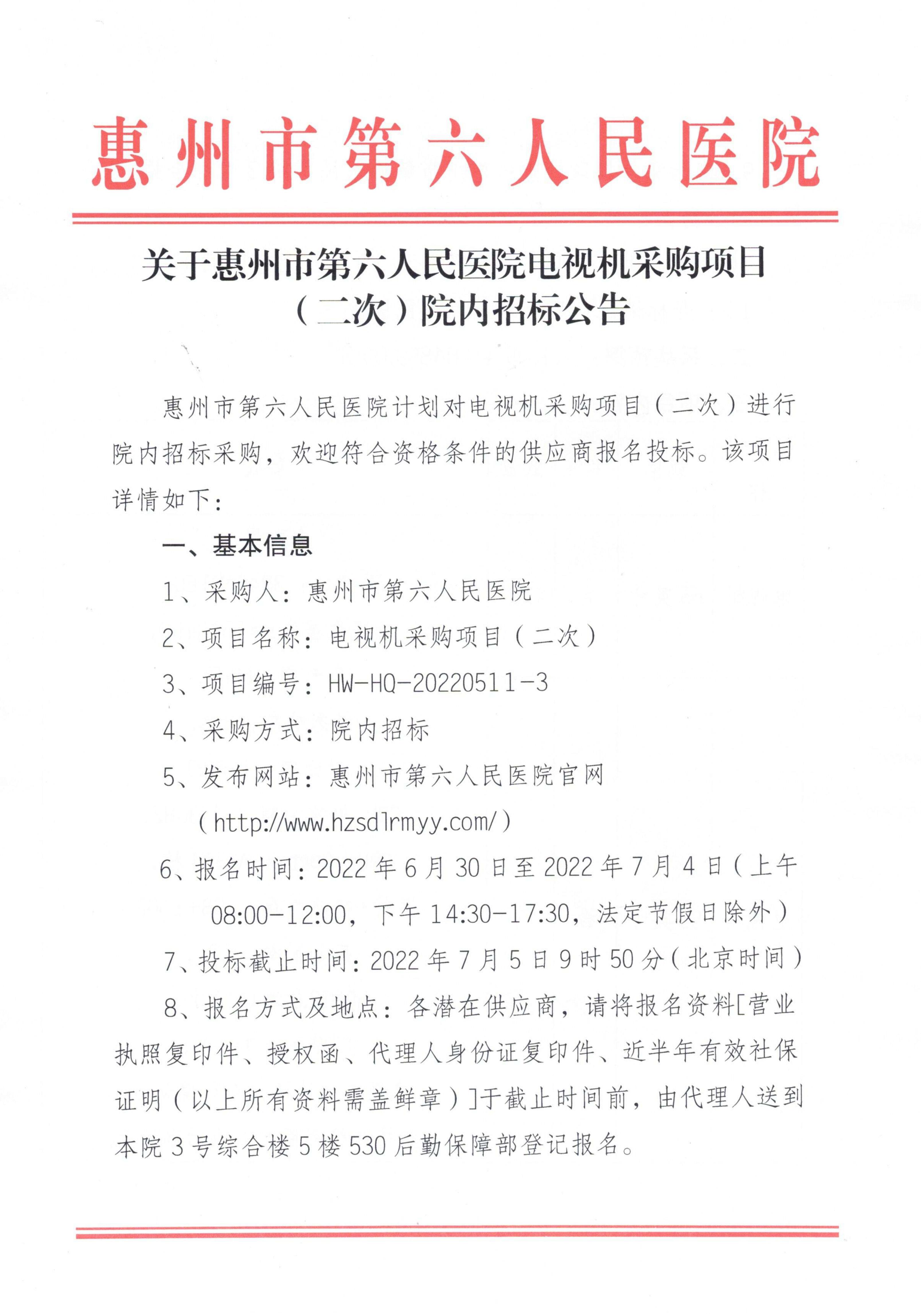關于惠州市第六人民醫院電視機采購項目(二次)院内招标公告
