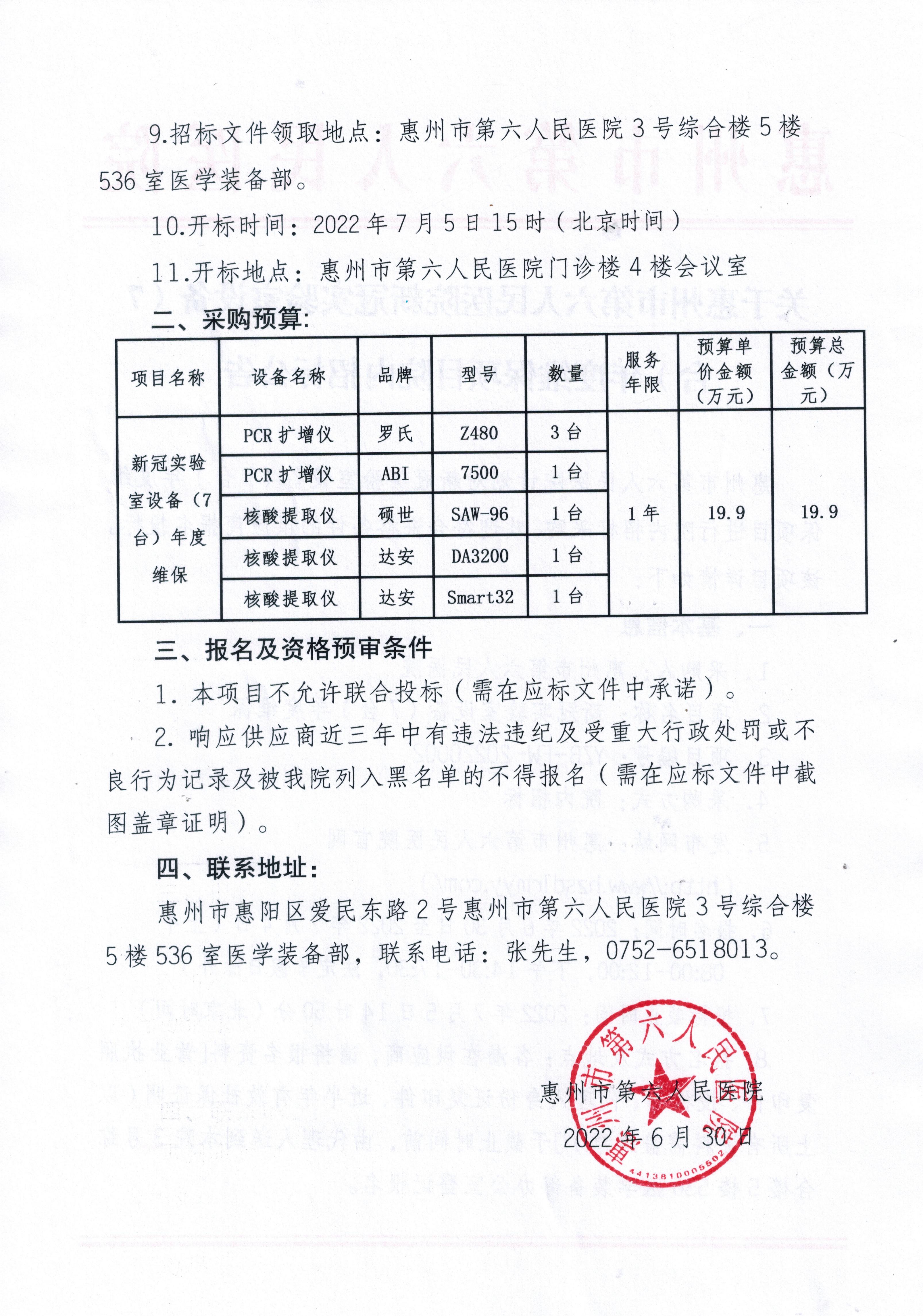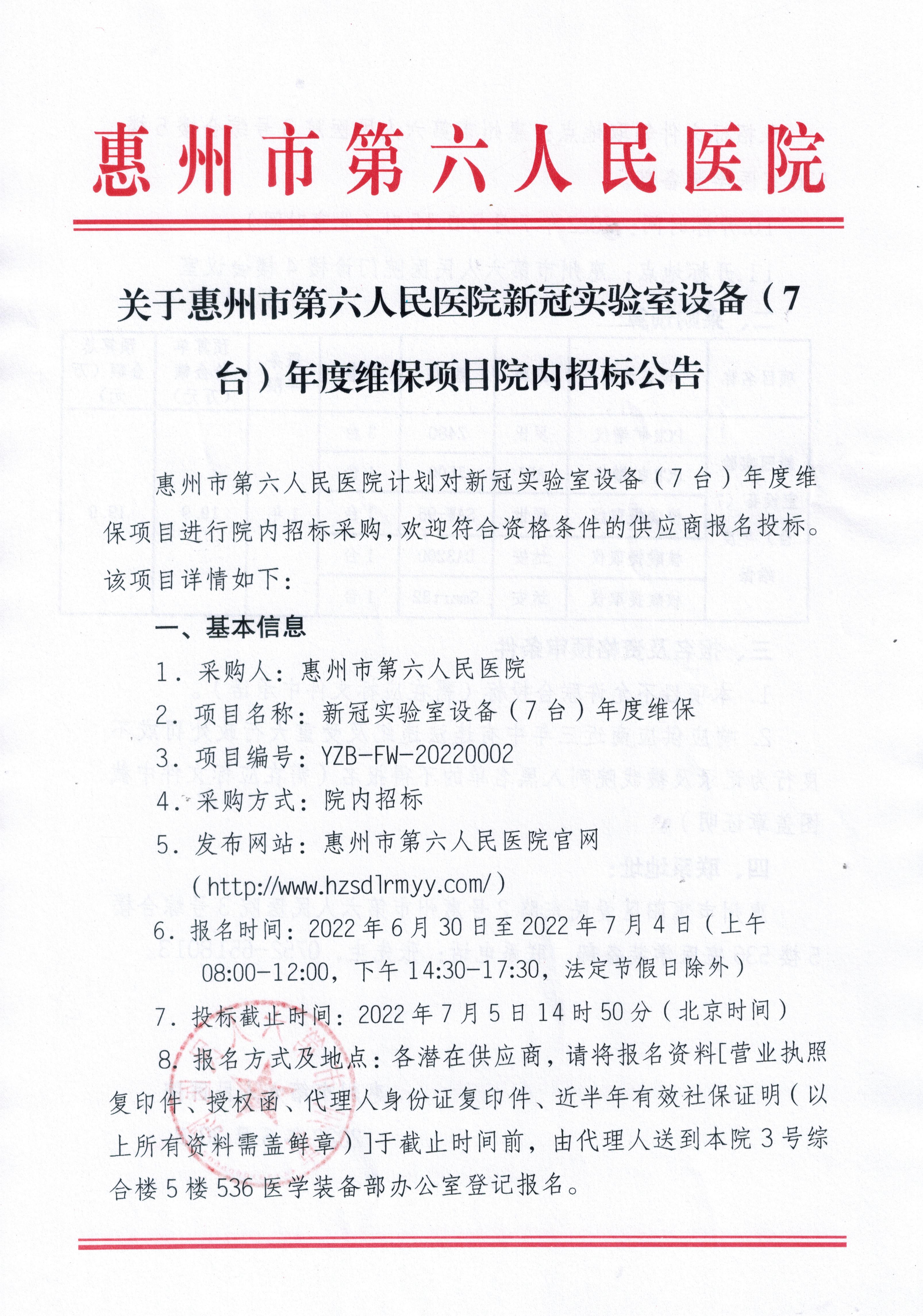 關于惠州市第六人民醫院新冠實驗室設備(7台)年度維保項目院内招标公告