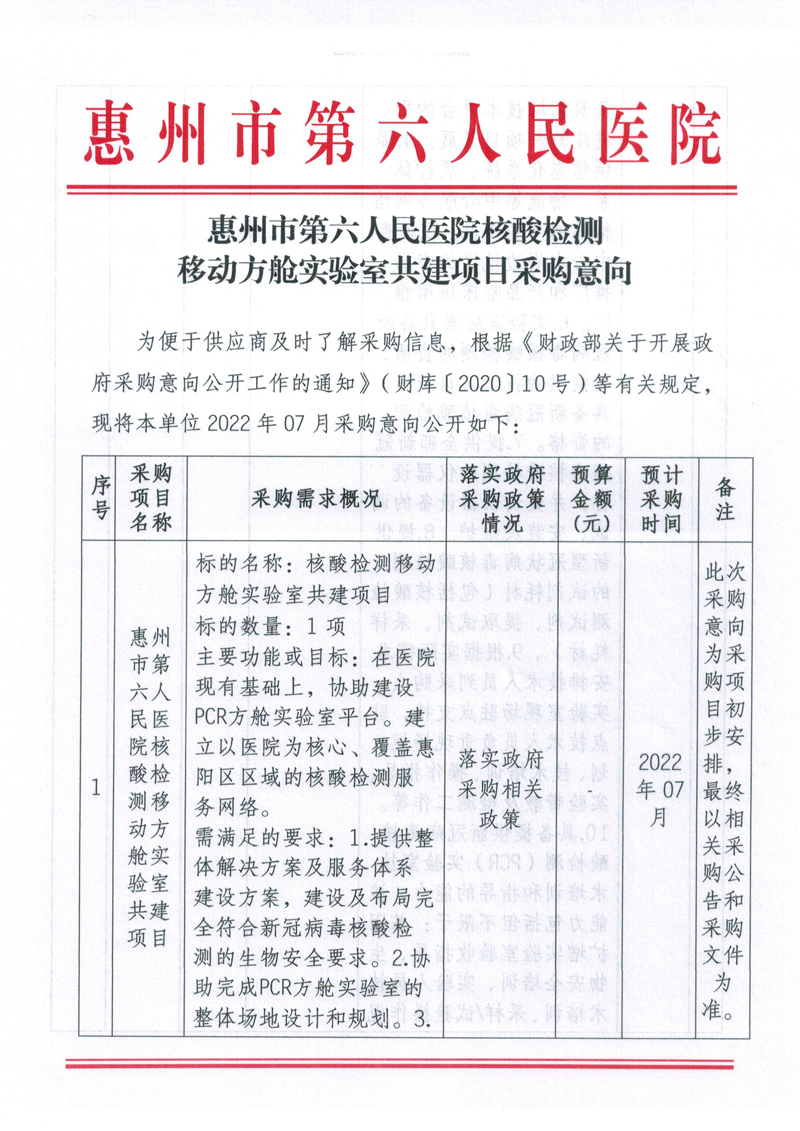 惠州市第六人民醫院核酸檢測移動方艙實驗室共建項目采購意向(xiàng)