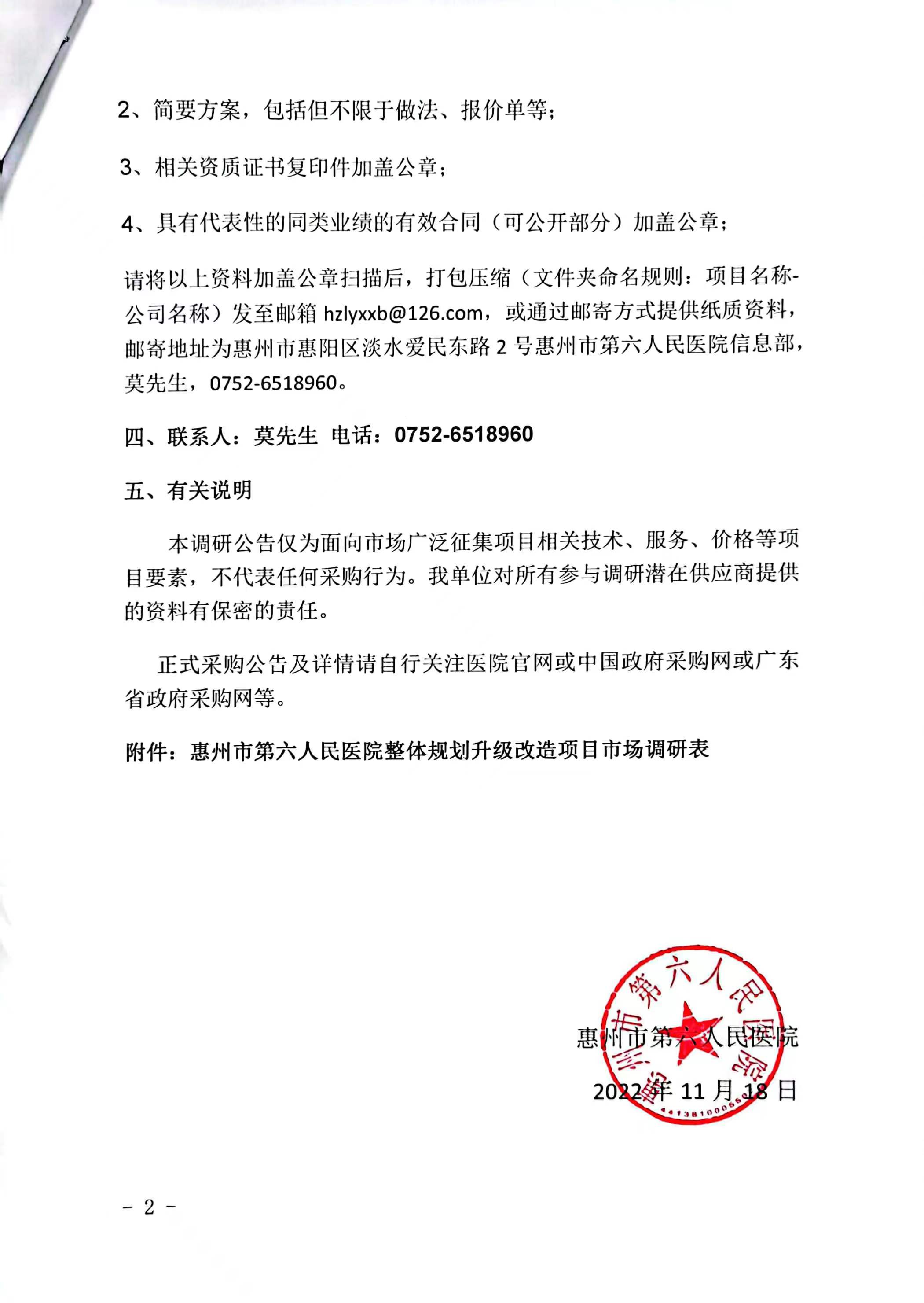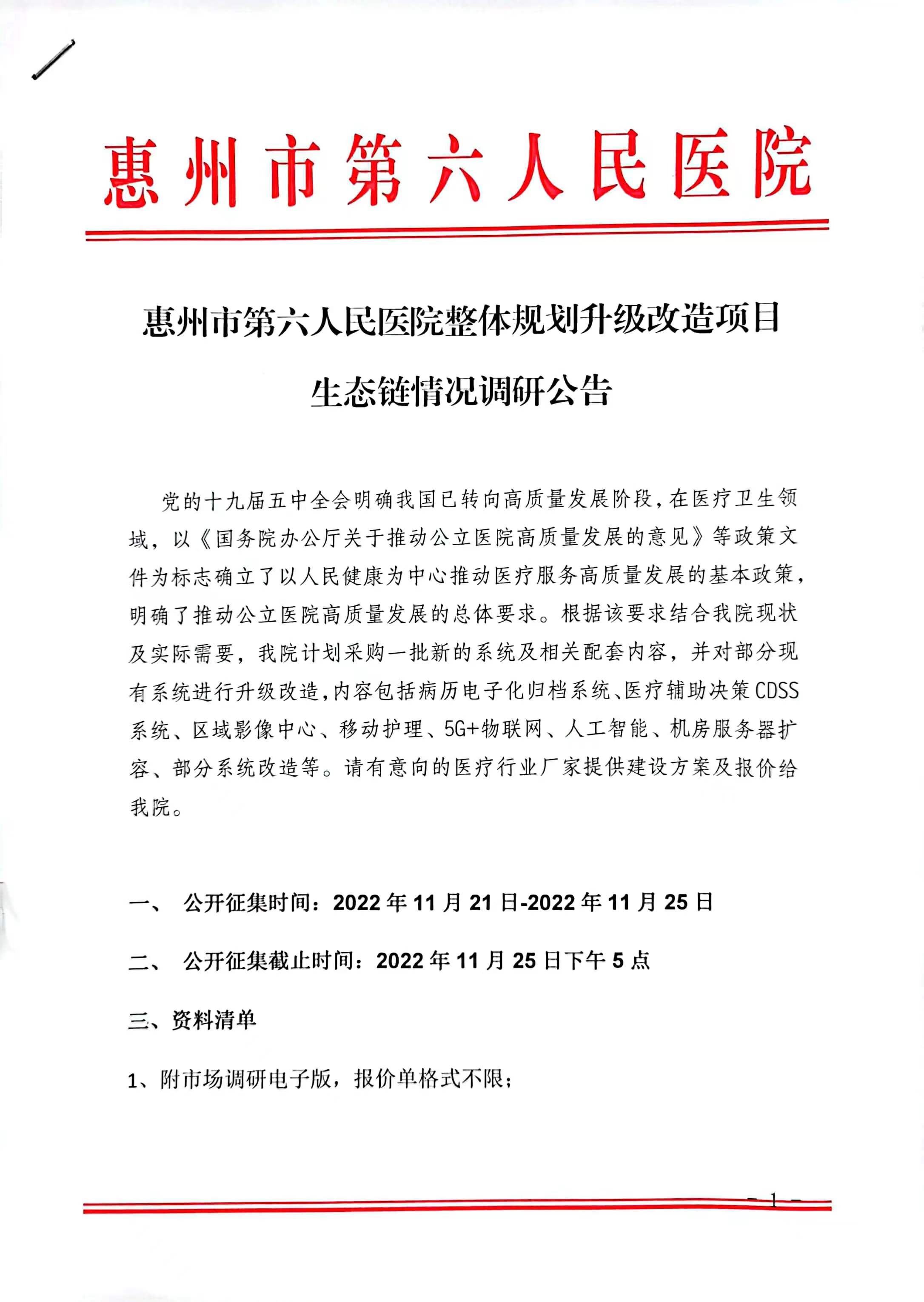 惠州市第六人民醫院整體規劃升級改造項目生态鏈情況調研公告