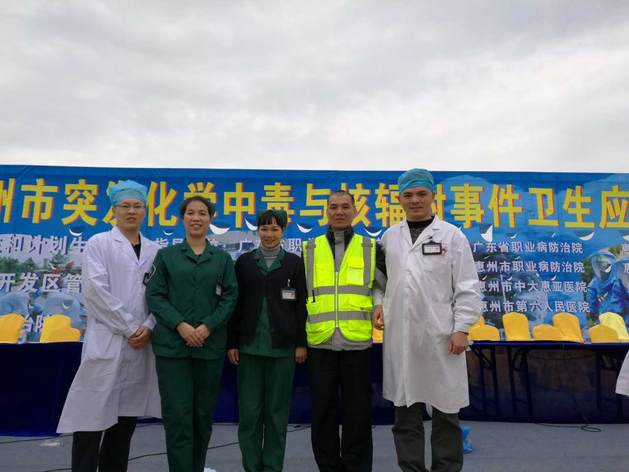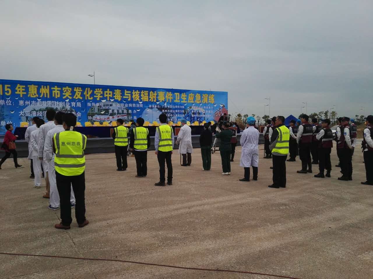 此次演練活動于2015年12月25日在大亞灣區舉行,副市長(cháng)劉冠賢和市公安、消防、環保、安監等部門領導,國(guó)家疾控中心、省衛計委、省職防院、省第二人民醫院等領導專家,以及河源市衛計局和各縣(區)衛生行政部門負責人也莅臨現場觀摩指導。參加演練的隊伍包括惠州市衛生和計劃生育局應急辦、廣東省職業病防治院、惠州市第一人民醫院、惠州市120急救指揮中心、惠州市職業病防治院、我院等7支隊伍共50人。