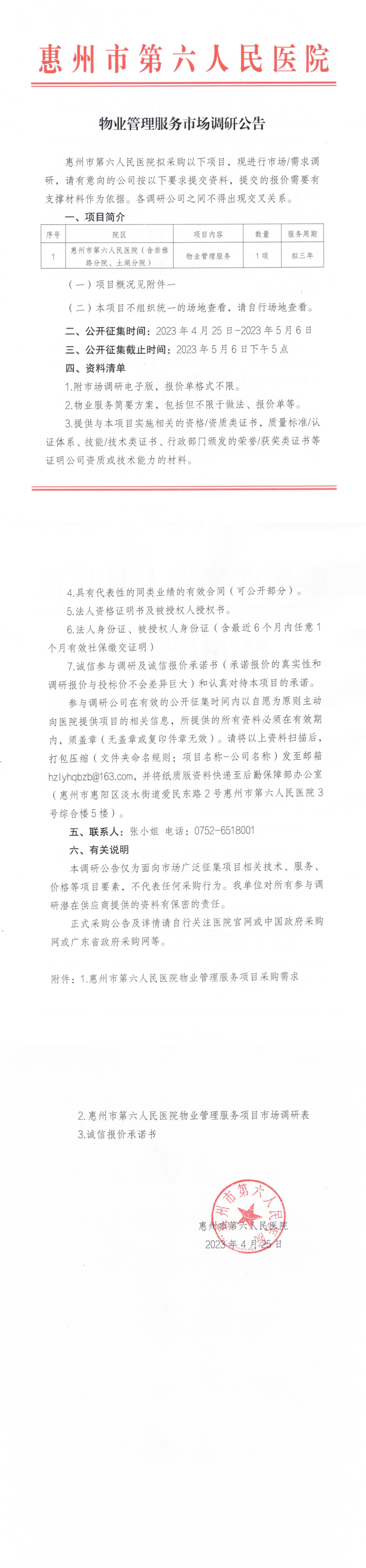 附件2:惠州市第六人民醫院物業管理服務市場調研表