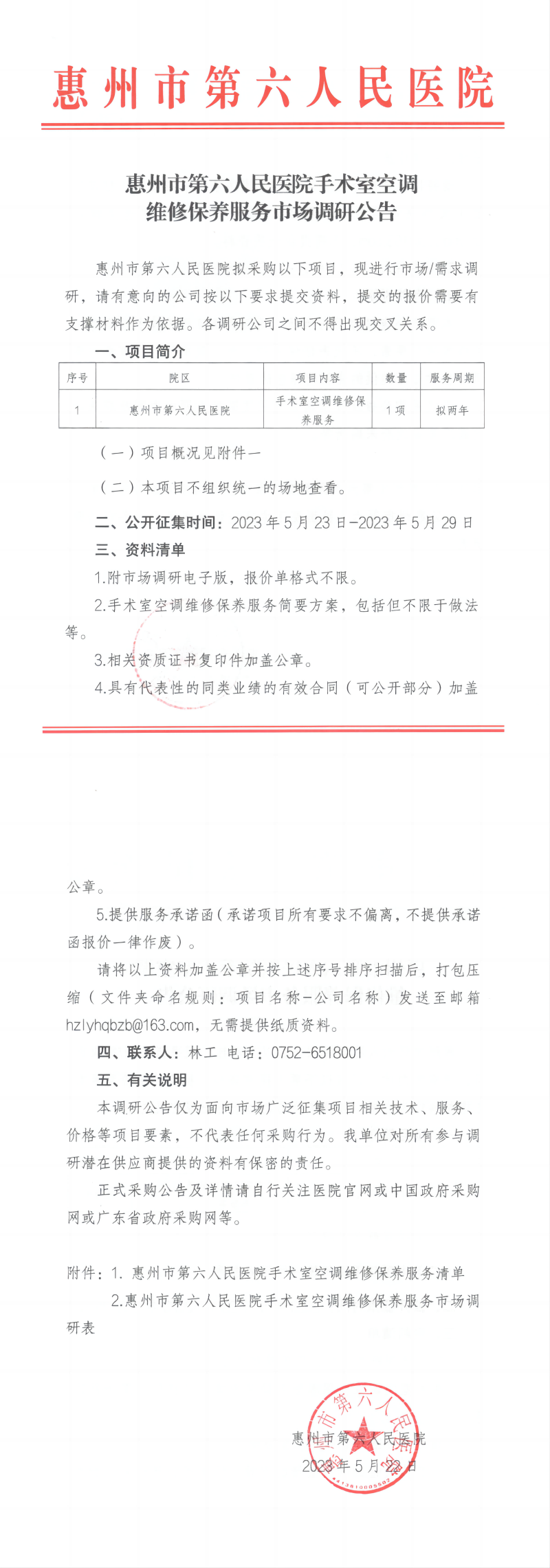 附件2:惠州市第六人民醫院手術室空調維修保養服務市場調研表