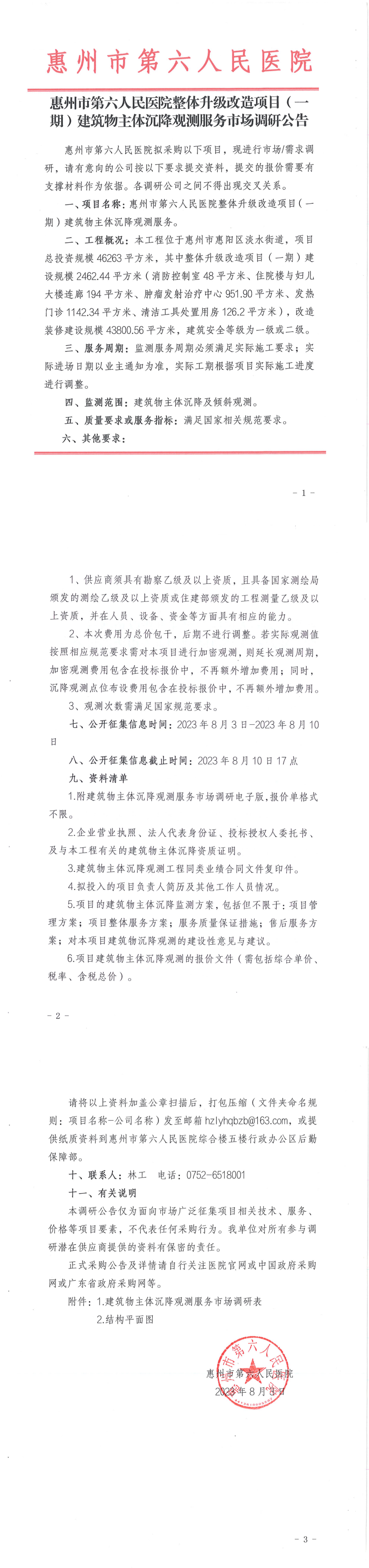 惠州市第六人民醫院整體升級改造項目(一期)建築物主體沉降觀測服務市場調研公告