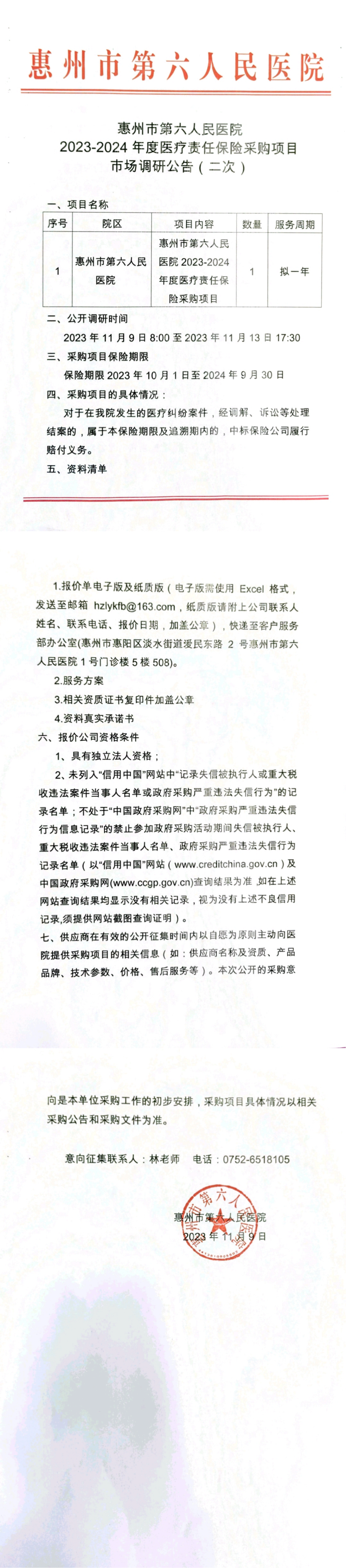 惠州市第六人民醫院2023-2024年度醫療責任保險采購項目市場調研公告(二次)