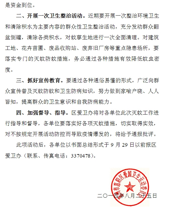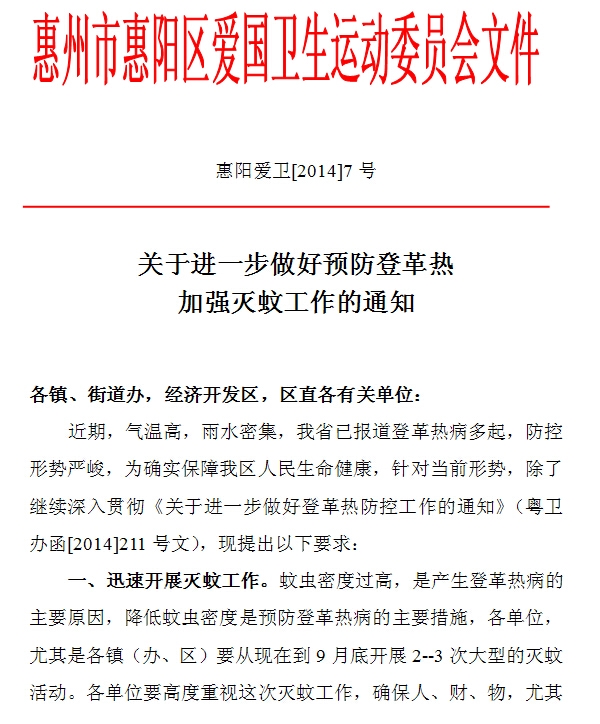 惠州市惠陽區愛國(guó)衛生運動委員會(huì)文件 關于進(jìn)一步做好(hǎo)預防登革熱 加強滅蚊工作的通知