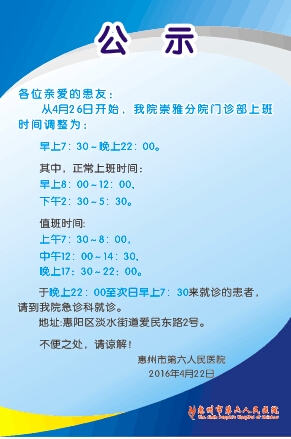 關于惠州市第六人民醫院崇雅分院門診部上班時(shí)間公示