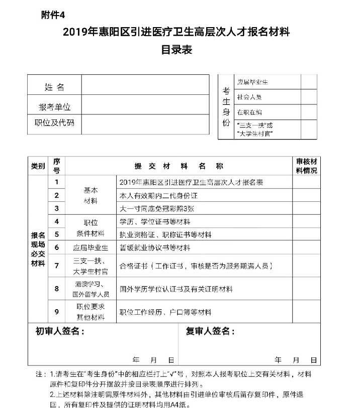附件4:2019年惠州市惠陽區引進(jìn)醫療衛生高層次人才報名材料目錄表