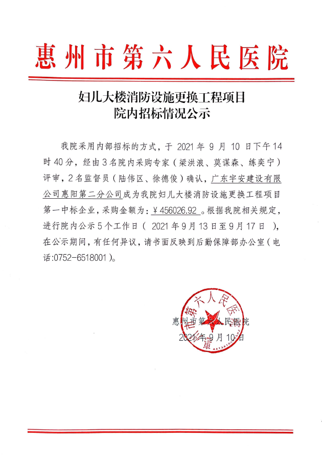 婦兒大樓消防設施更換工程項目院内招标情況公示