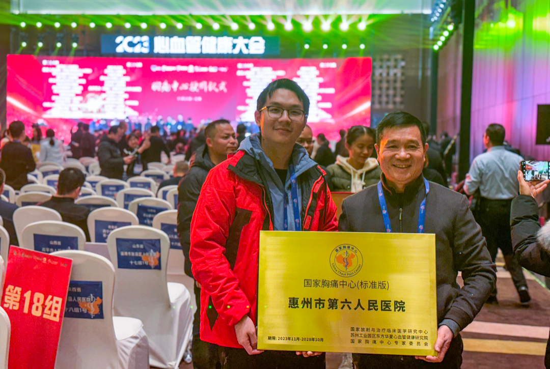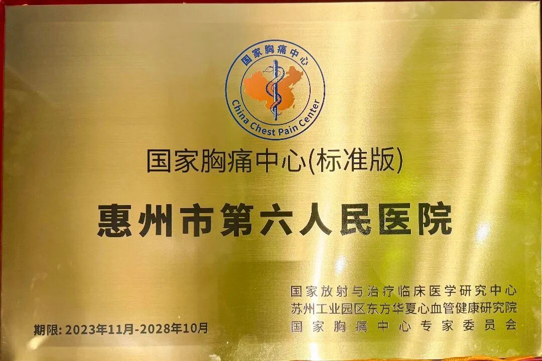 2023年11月25日,在2023心血管健康大會(huì)(CCHC)上,惠州市第六人民醫院再次被(bèi)授予“國(guó)家胸痛中心(标準版)”牌匾,标志著(zhe)惠州六院胸痛中心複審工作圓滿結束,順利通過(guò)中國(guó)胸痛中心再認證。