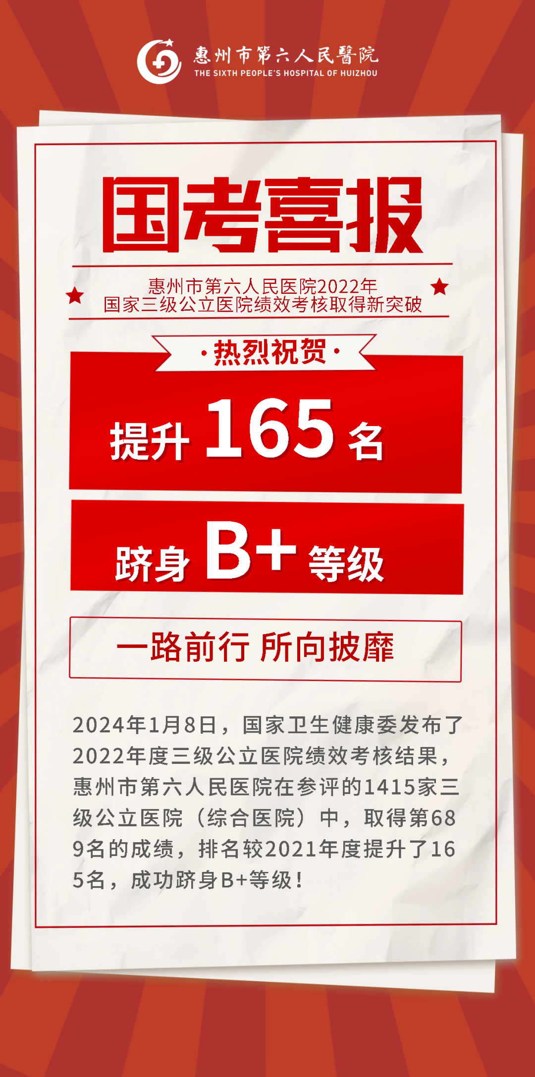 2024年1月8日,國(guó)家衛生健康委發(fā)布了2022年度三級公立醫院績效考核結果,惠州市第六人民醫院在全國(guó)參評的1415家三級公立醫院 (綜合醫院) 中,取得第689名的成(chéng)績,排名較2021年度提升了165名,成(chéng)功跻身B+等級!