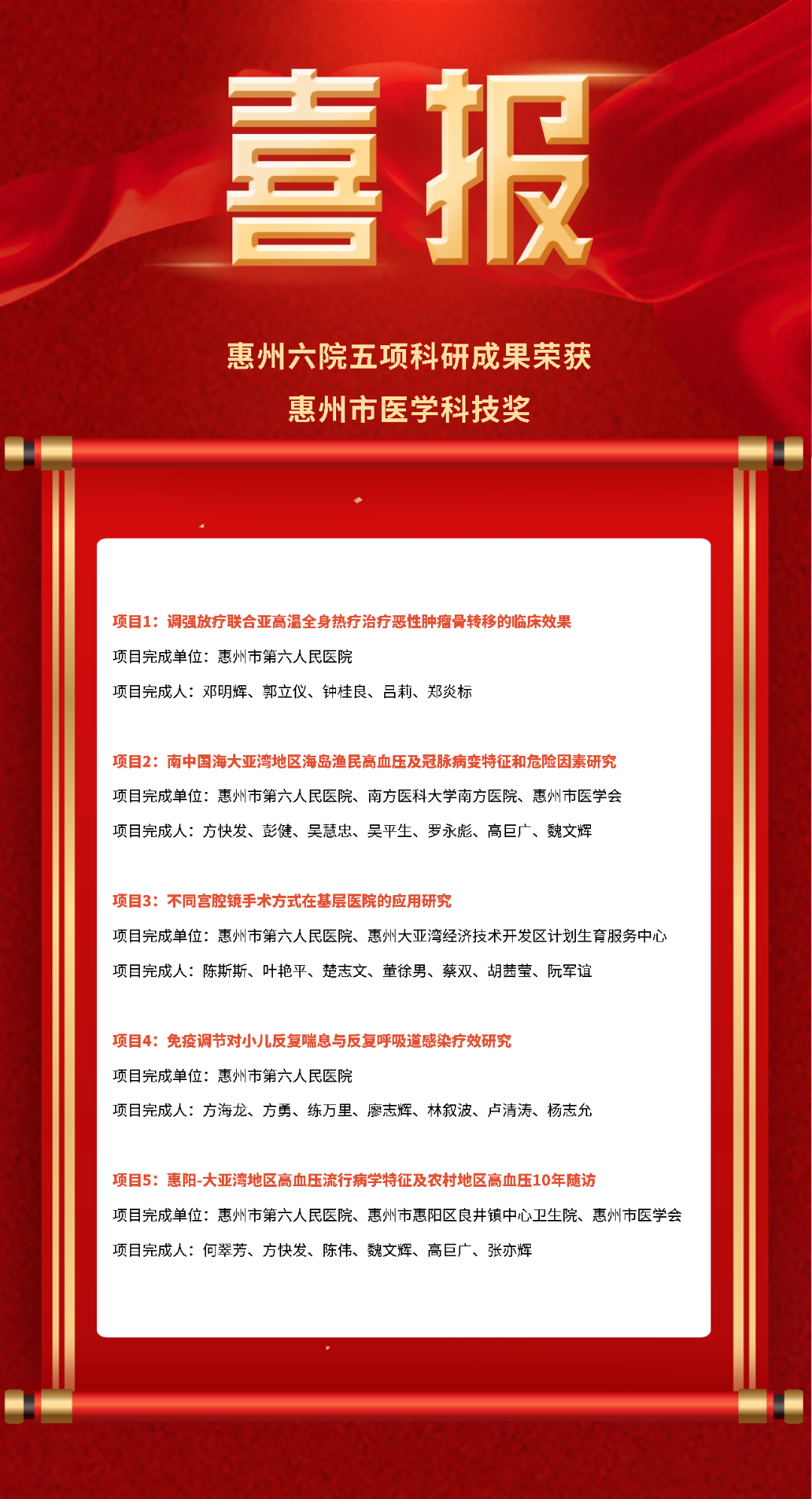 2023年度惠州市第六人民醫院共有五項科研成(chéng)果榮獲惠州市醫學(xué)科技獎。